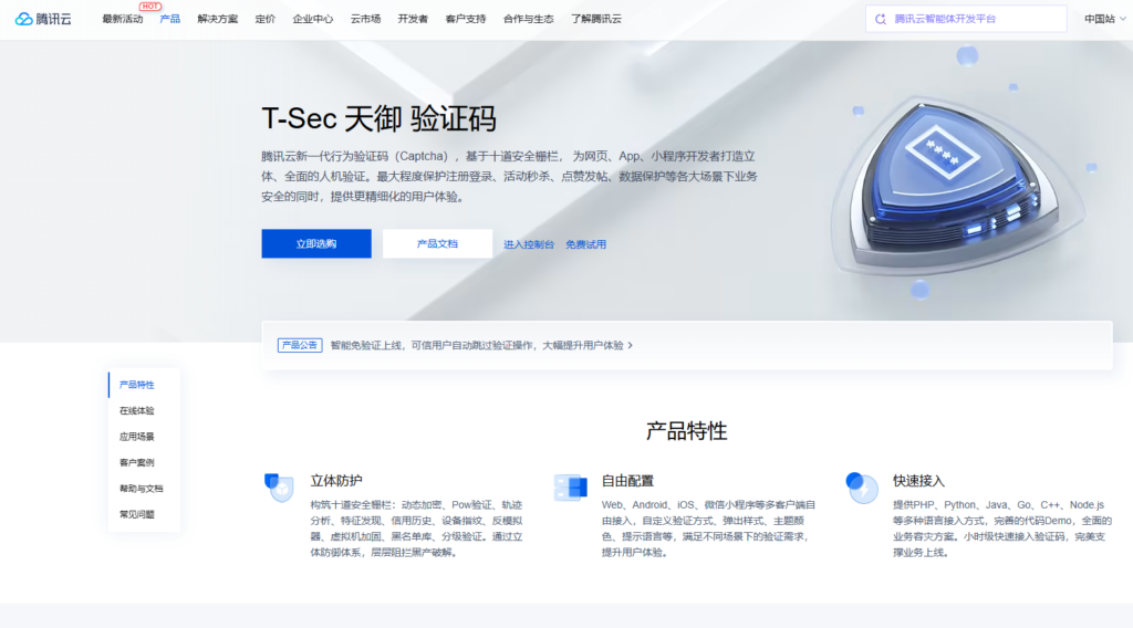 天御验证码是腾讯云旗下的核心安全产品,深度融合了腾讯多年来在QQ、微信等海量业务中积累的恶意对抗经验。它利用腾讯的安全大数据系统,能够实时分析当前访问的恶意情况。该产品的一个特色是其智能分级策略,能够让正常用户获得免验证或轻量验证的流畅体验,而对疑似恶意用户则下发高难度的验证挑战。