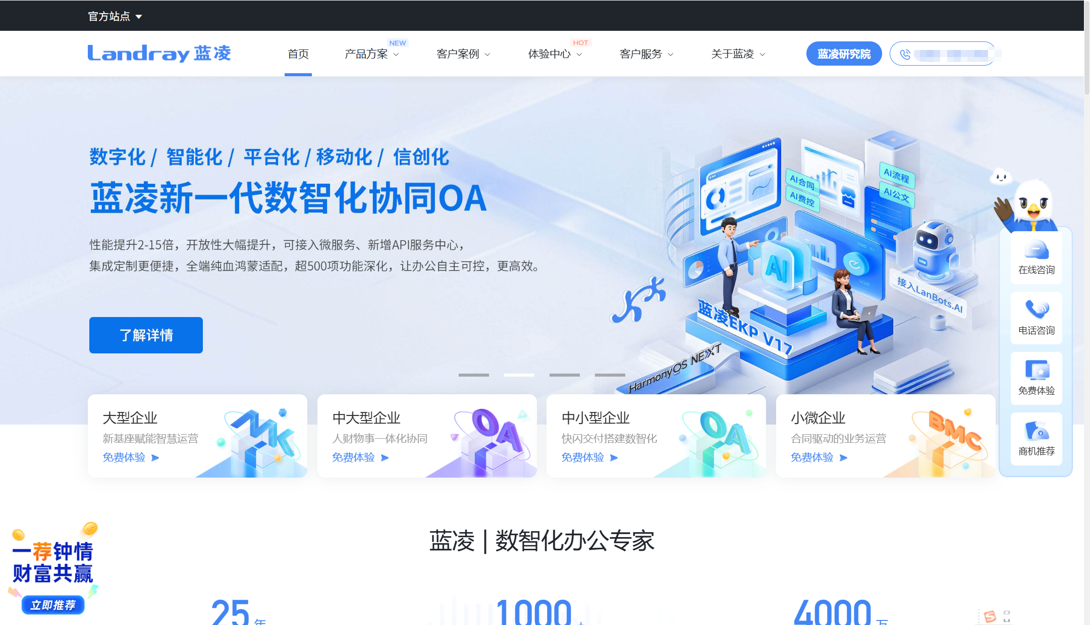如果你在选型中更关注“项目推进需要强流程支撑”,蓝凌相关页面还强调移动化审批、数据洞察与智能化流程辅助等方向。总体评价更偏向:它适合把项目管理融入企业协同体系的场景,通过流程、权限与文档体系来支撑跨部门协作与治理;选型时可以把你们的立项/审批/验收关键节点逐条映射到系统能力上做验证。