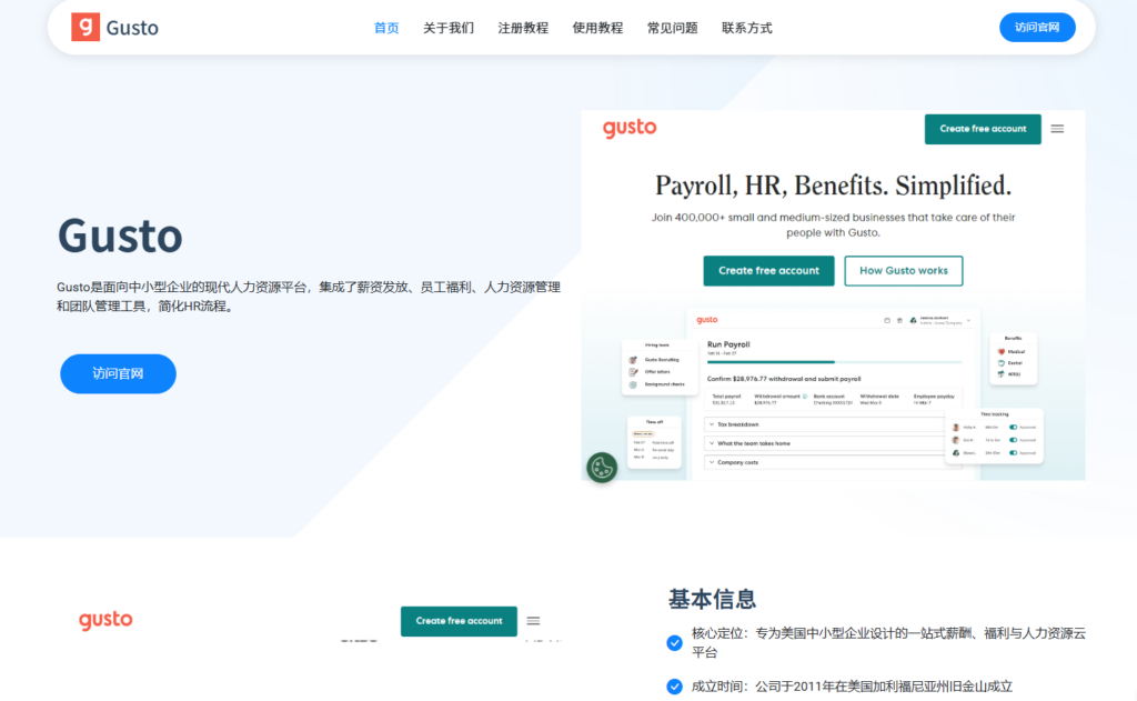 Gusto 是一款专门为中小型企业设计的自动化薪酬与人力资源管理工具,以其用户友好的界面设计和极致的自动化体验在北美市场广受好评。它不仅能自动计算、发放薪资,还能自动扣除并缴纳联邦及各州的薪资税。