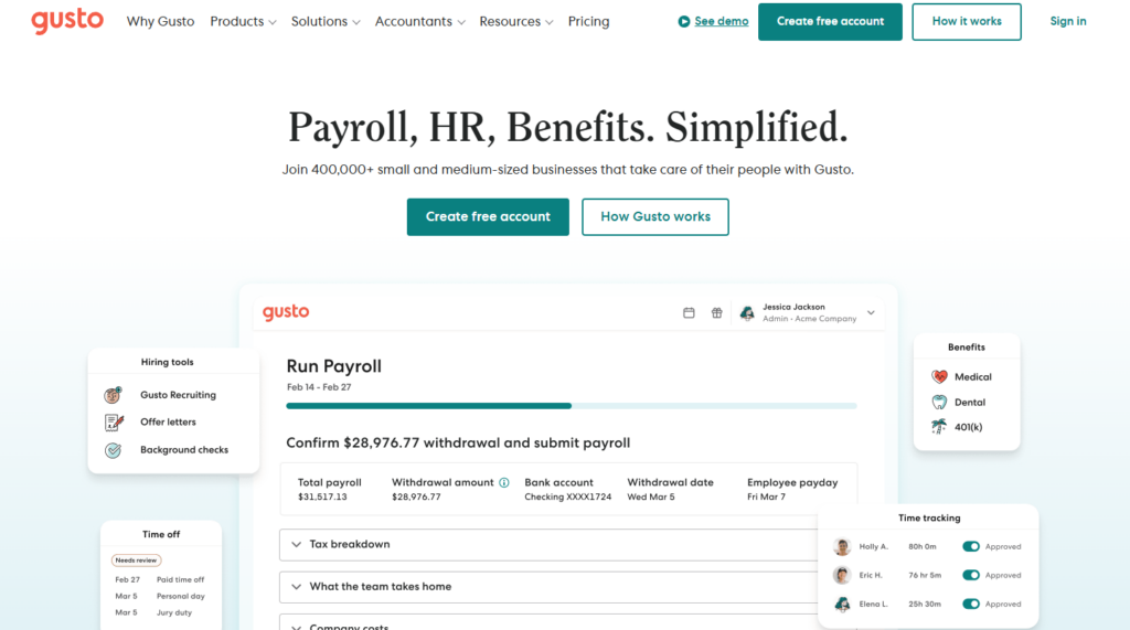 Gusto 是一款备受北美小微企业青睐的薪酬管理平台,以其清新直观的用户界面和自动化的税务处理能力而闻名。它将薪酬发放、福利保险及人力资源管理无缝集成,系统会自动计算并缴纳联邦及州级税款,极大地减轻了小型企业在财税合规方面的负担。