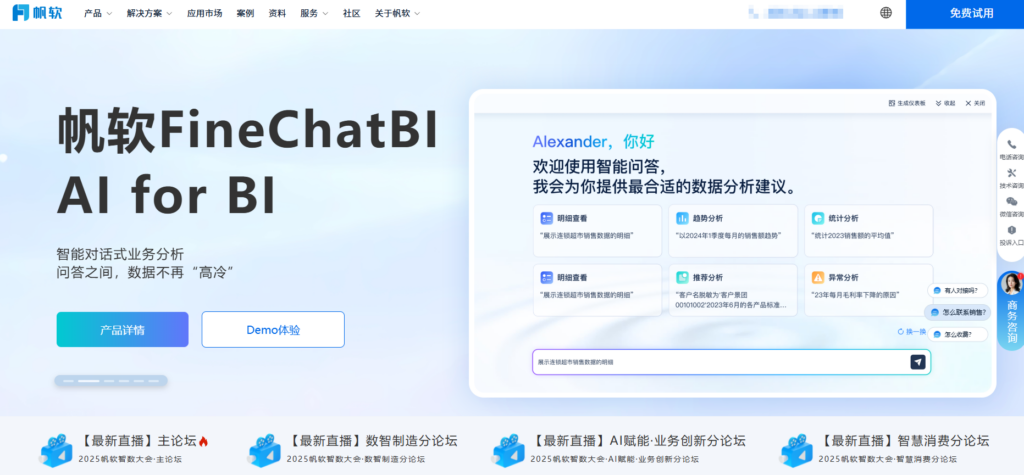 该平台在 2025 年获得国家级专精特新“小巨人”荣誉,体现了其在核心技术水平上的稳健性。永洪 BI 能够深度融合机器学习与自然语言处理技术,通过全新的 AI+BI 智能分析模块,帮助企业从简单的报表展现进化到复杂的业务归因与趋势预测,尤其适合制造业和金融业进行深度的数字化经营。