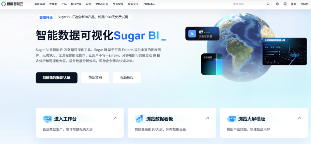 Sugar BI 是百度智能云推出的数据可视化与智能分析平台,依托百度强大的可视化渲染引擎,其报表在大屏展示和交互动效上具有显著优势。它不仅支持丰富的 3D 视觉效果,还深度集成了百度的人工智能技术,支持通过自然语言进行智能取数。
