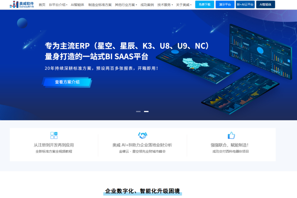 奥威软件旗下的 Power-BI 是一款专注于将商业智能与 ERP 系统深度融合的平台。它针对金蝶、用友等主流 ERP 预置了大量的标准数据方案,能够快速实现从财务、销售到库存的跨模块数据整合,极大地缩短了企业从安装到看到分析报表的时间。