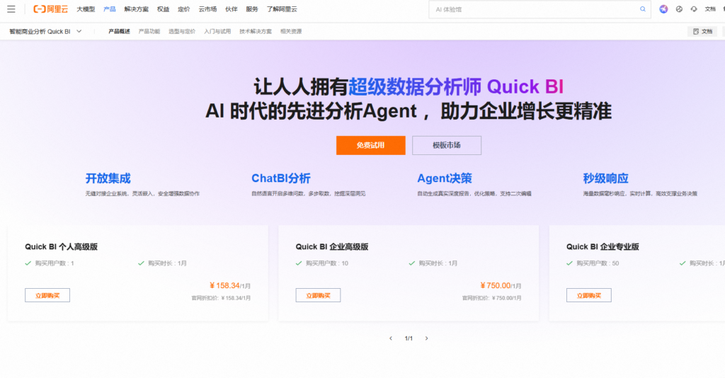阿里Quick BI 是阿里巴巴集团基于多年双 11 场景沉淀而成的云原生智能分析平台,也是首个入选 Gartner 魔法象限的国产 BI 产品。它深度集成了阿里云的数据生态,能够与 MaxCompute、Hologres 等云数据库完美配合,实现极速的数据查询体验。Quick BI 主打“全渠道数据办公”,通过与钉钉的深度绑定,将数据报表直接推送到工作流中,实现了“人找数据”向“数据找人”的转变。