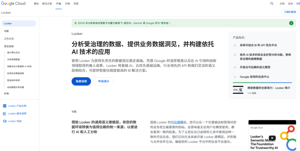 Looker 是 Google Cloud 旗下的现代数据平台,它通过创新的 LookML 建模语言彻底重构了数据分析的流程。LookML 允许数据工程师在中心化的层级定义所有业务指标,这保证了无论哪个部门、使用哪个报表,所引用的数据口径永远是一致的,解决了企业中常见的“同一指标多个版本”的困扰。