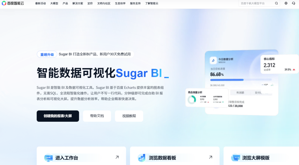 百度 Sugar BI 是百度智能云推出的敏捷 BI 平台,深度整合了百度的可视化图表库与前沿的人工智能技术。其核心特色在于高度的配置化体验,用户无需编写代码即可快速搭建出具备电影级视觉效果的数据大屏,极大地降低了企业构建数字化驾驶舱的门槛。