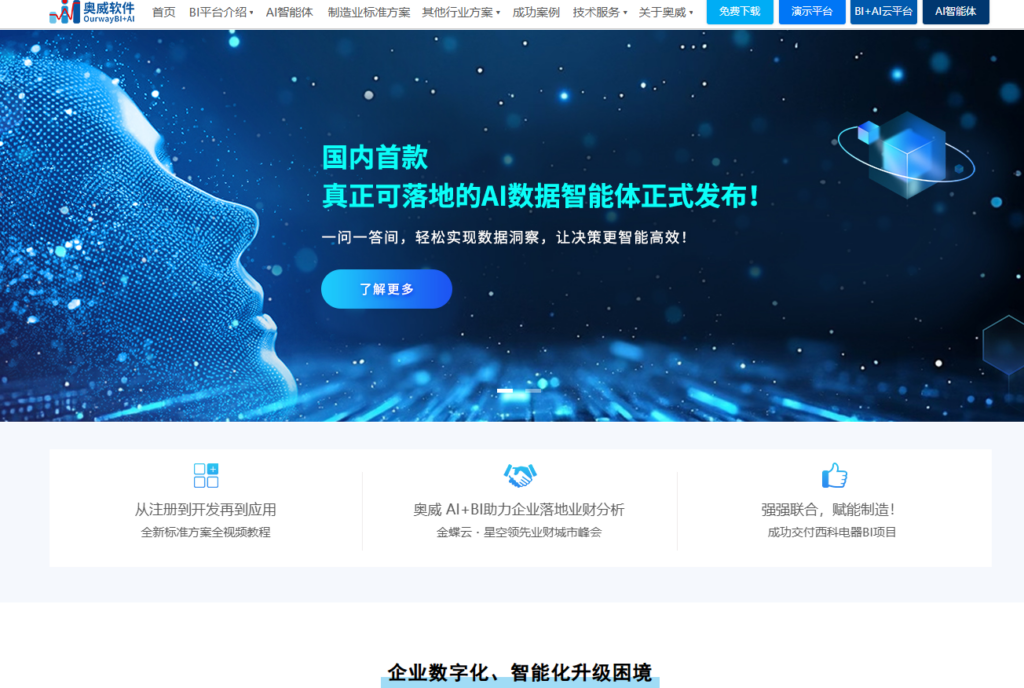 该产品非常强调业务人员的自主操作能力,通过拖拽式设计实现多维动态分析。奥威 BI 在制造业和零售业拥有广泛的客户基础,其方案能够精准对接企业的财务、销售及供应链数据,提供深度的数据挖掘与预警功能,是追求快速上线和业务贴合度企业的理想选择。