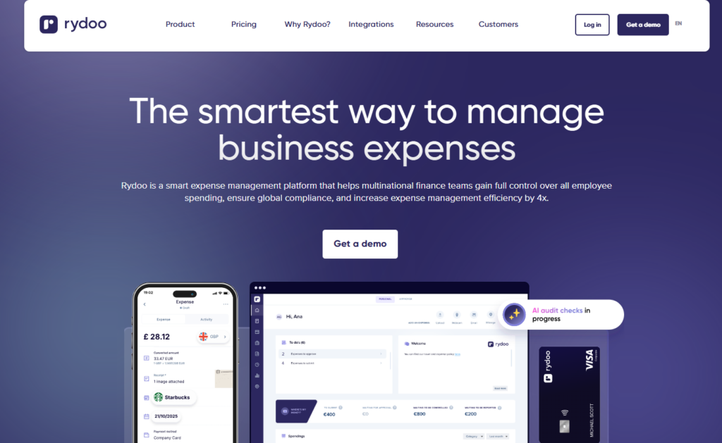Rydoo是一家总部位于欧洲的全球性费控系统供应商,以简洁的界面设计和快速的全球部署能力著称。它支持多语言、多币种以及全球各地的税务合规要求,适合在全球范围内拥有分支机构的跨国企业。
