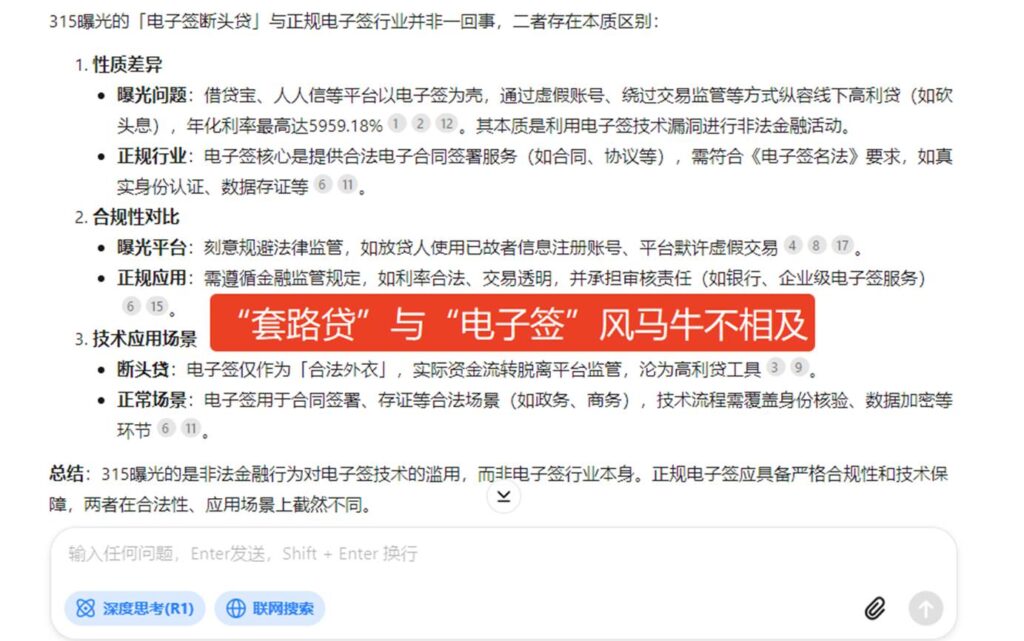 看了315的相关报道后,曝光套路贷本来是正向的,却将电子签和高利贷混为一谈。这种无意识的混淆不仅会误导大众,也不利于新兴技术的健康发展。