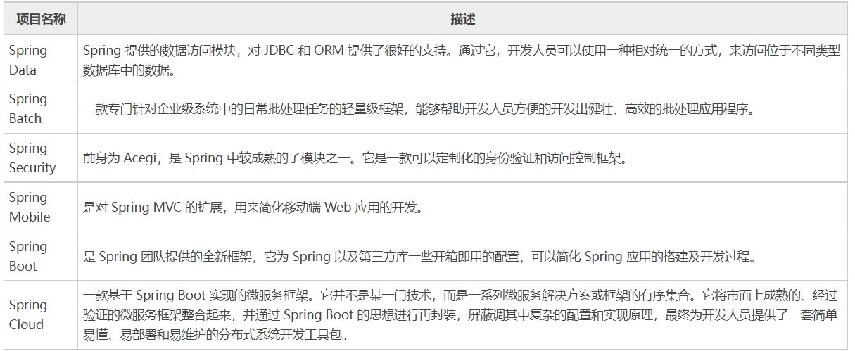 经过十多年的发展,Spring 已经不再是一个单纯的应用框架,而是逐渐发展成为一个由多个不同子项目(模块)组成的成熟技术,例如 Spring Framework、Spring MVC、SpringBoot、Spring Cloud、Spring Data、Spring Security 等,其中 Spring Framework 是其他子项目的基础。