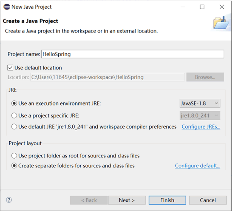 在 Eclipse 中创建一个简单的 Java 项目,依次单击 File -> New -> Java Project,这里将项目名称设置为 HelloSpring。