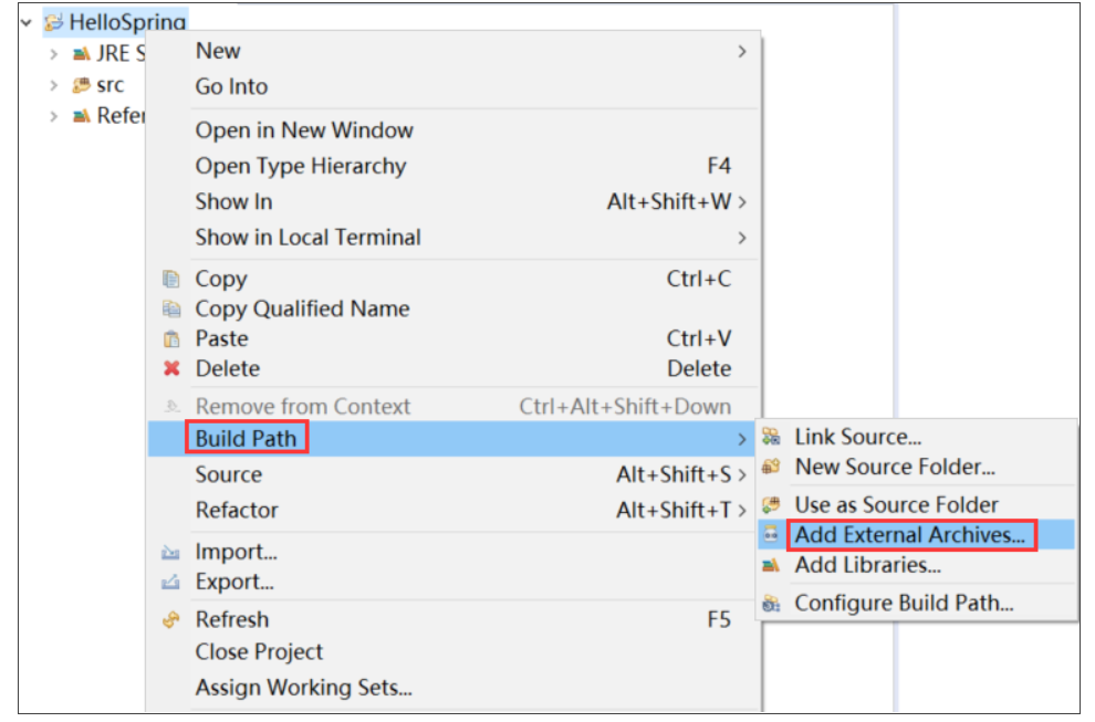 1. 鼠标右键点击 HelloSpring 项目,然后在弹出的菜单中选择 Build Path -> Add external archives,选择 Spring 的 jar 包。