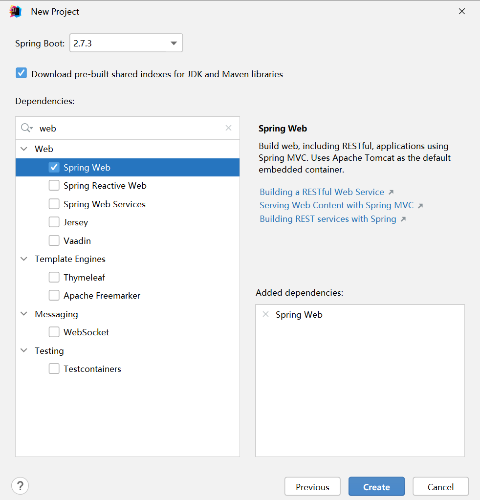 在依赖模块选择Spring Web和Spring Boot DevTools这两个依赖(第二个依赖也可以不选)然后创建: