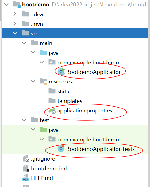 src/main/java下的程序入口:BootdemoApplicationsrc/main/resources下的配置文件:application.propertiessrc/test/下的测试入口:BootdemoApplicationTests
