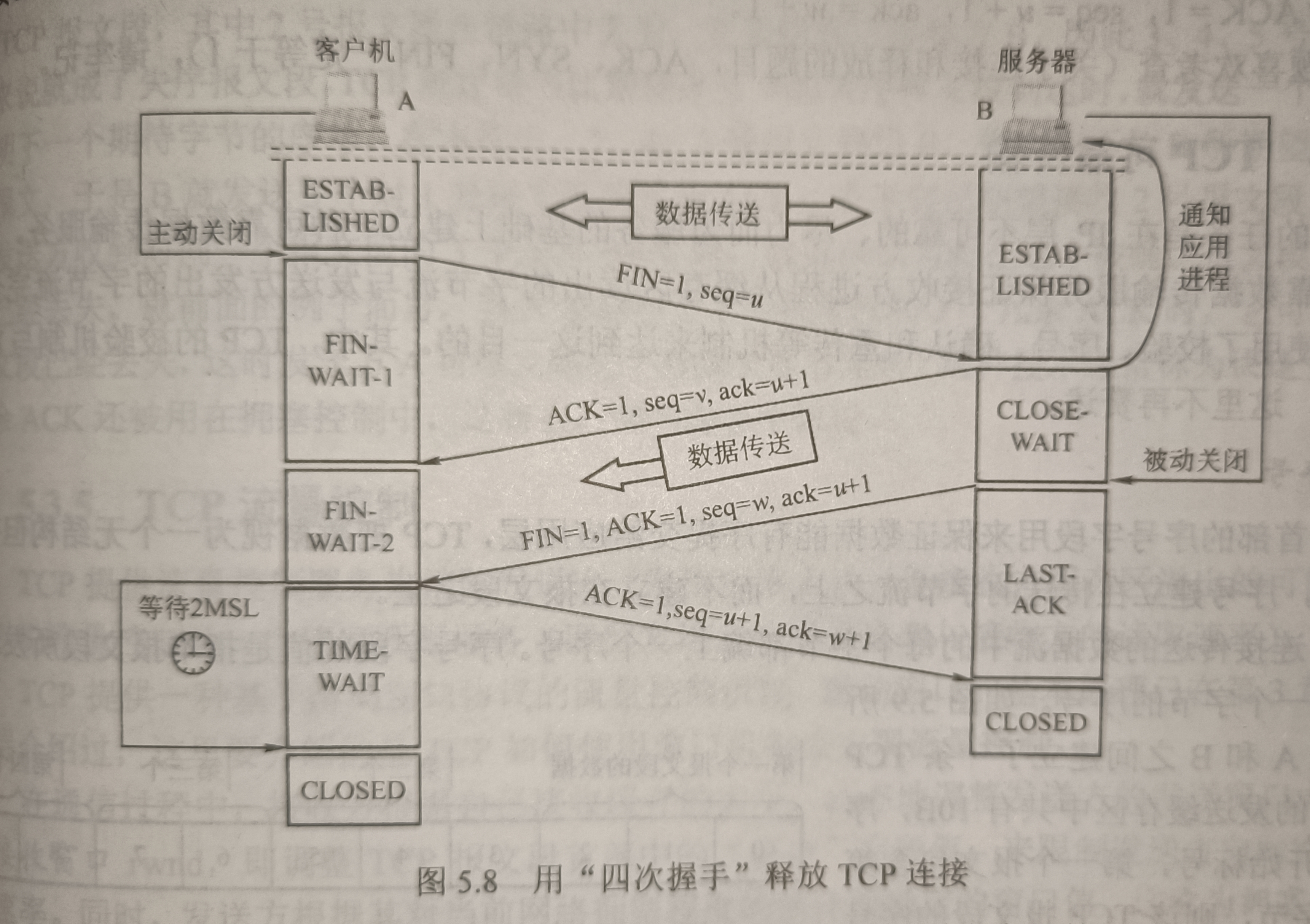 - 客户机收到连接释放报文段后必须发出确认。把确认报文段中的确认位ACK=1,确认号ack=w+1,序号seq=u+1。此时TCP还未释放,必须等待计时器设置的时间2MSL(最长报文段寿命)后,客户机才进入CLOSED(连接关闭)状态。