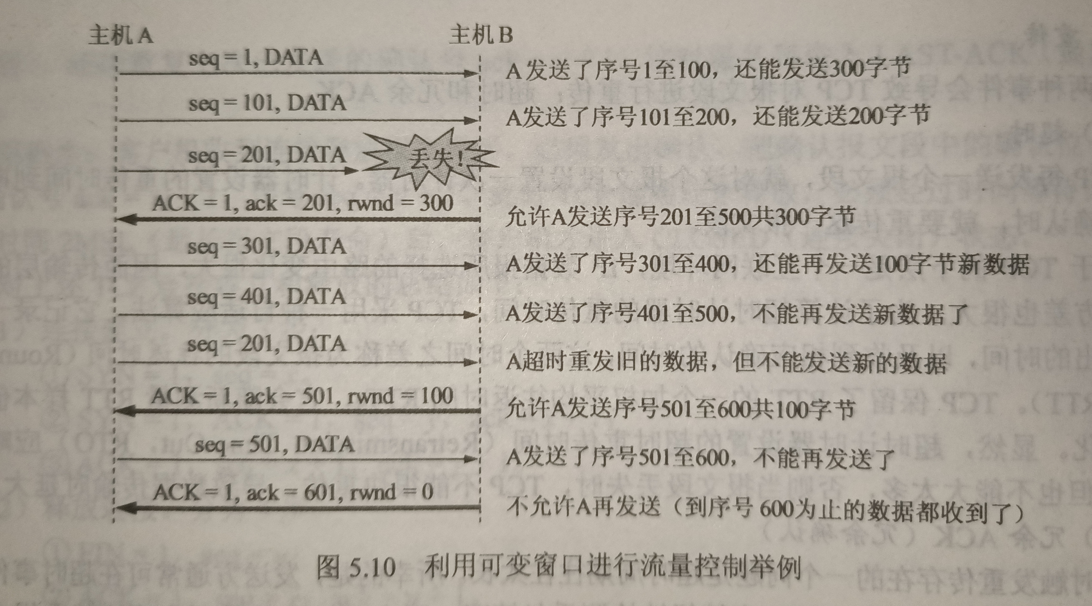 - 接收方根据自己缓存区的大小,动态地调整发送方发送窗口的大小,称为_接收窗口rwnd_,即调整TCP报文段首部中的“窗口”字段值,来限制发送方的窗口大小。
