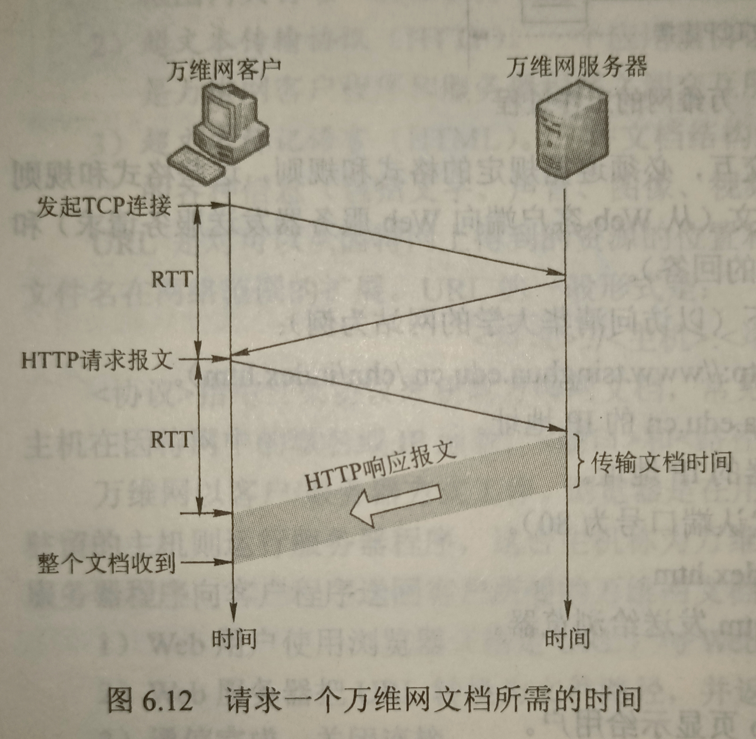 请求一个万维网文档所需的时间是该文档的传输时间(与文档大小成正比),再加上两倍的往返时间RTT(一个往返时间用于建立TCP连接,另一个往返时间用于请求和接收文档)。