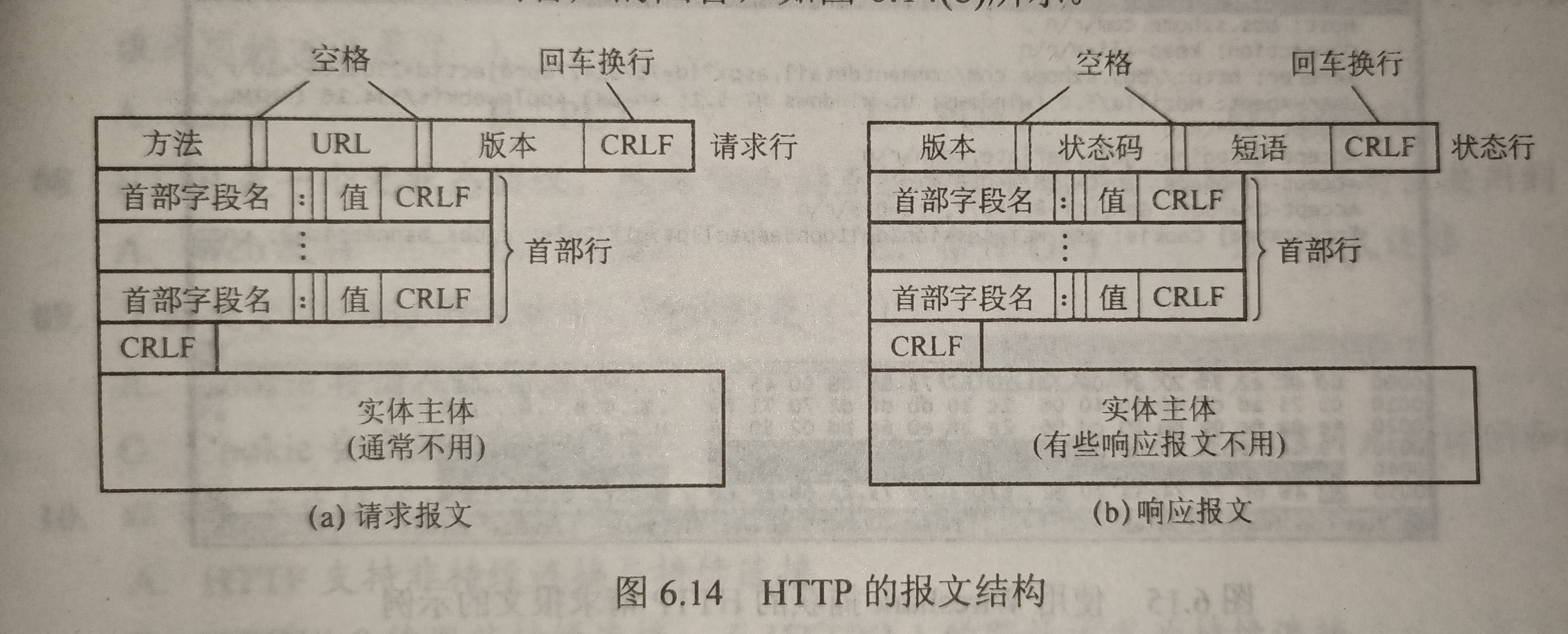 首部行:用来说明浏览器、服务器和报文主体的一些信息。首部也可以不使用。每个首部行中都有首部字段和值,每一行在结束的地方都要有回车和换行,整个首部行结束时还有一个空行,将首部行和后面的实体主体分开。