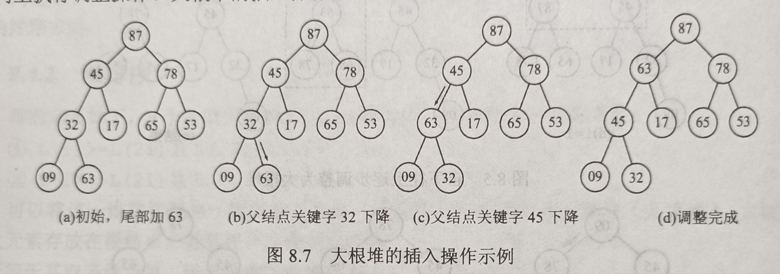 插入元素时,将新结点放至堆的末尾,然后逐层向上调整。