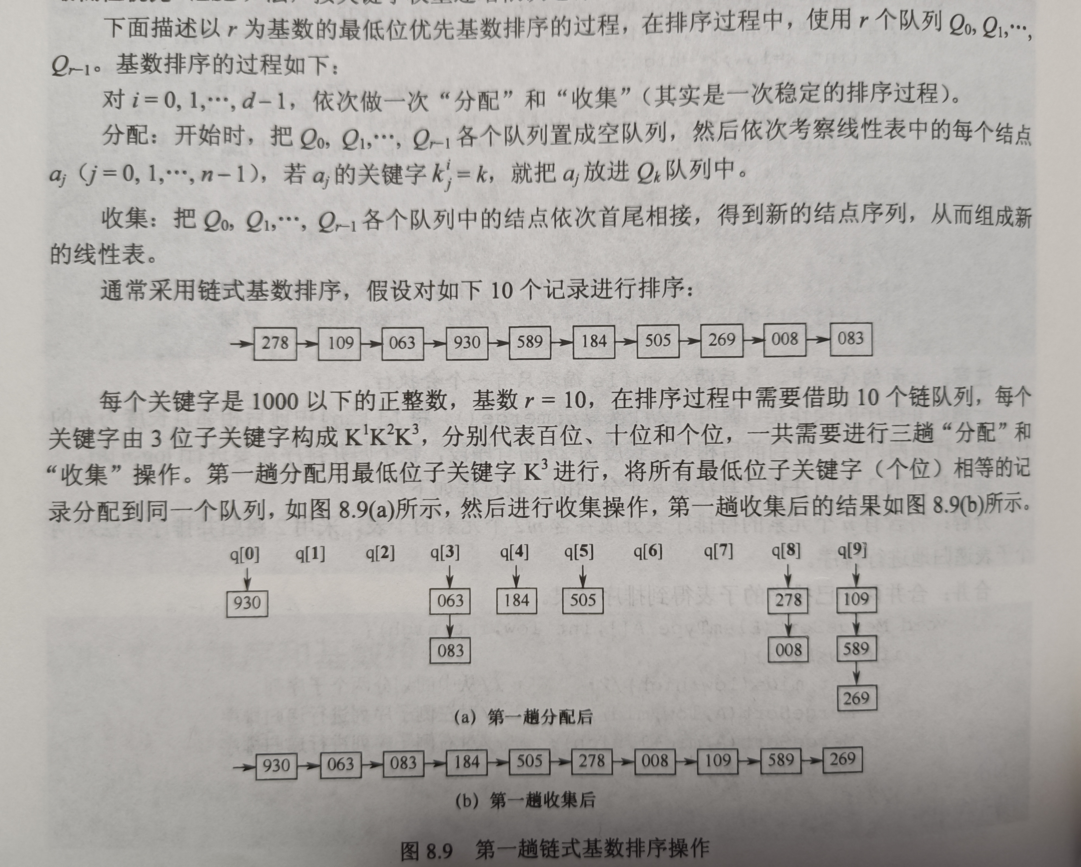 基本思想:不基于比较和移动,而是基于关键字各位的大小进行排序。是一种借助多关键字排序的思想对单逻辑关键字进行排序的方法。