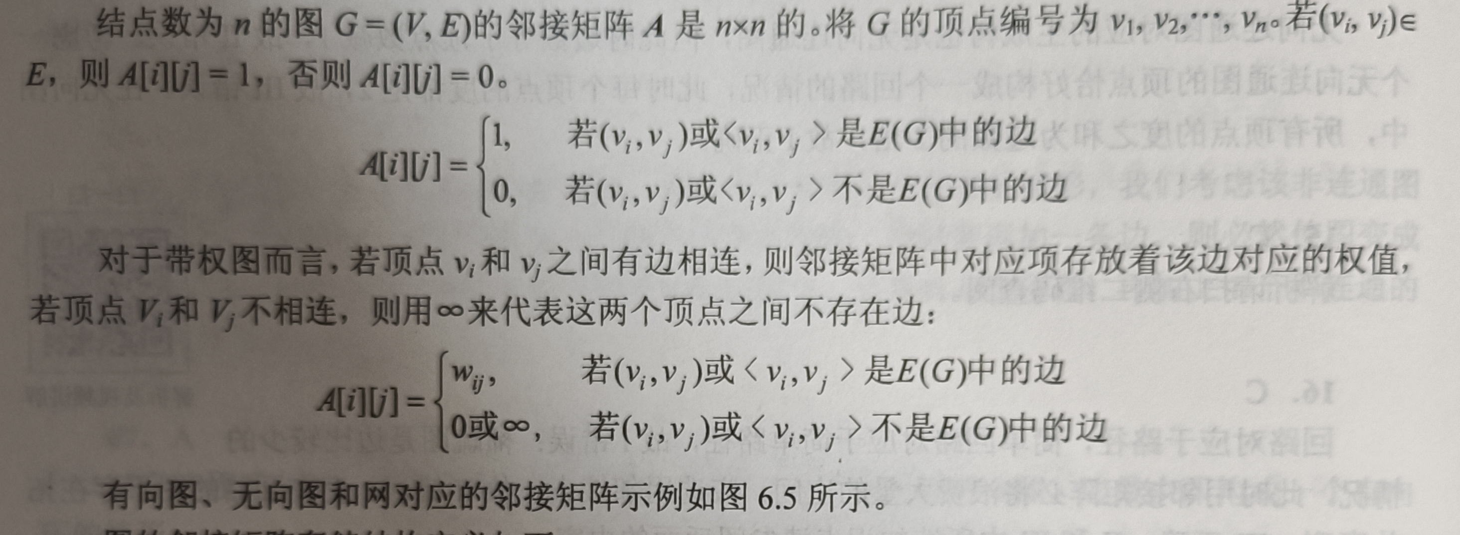 无向图的邻接矩阵的第i行(或第i列)非零元素(或非∞元素)的个数是顶点i的度TD(vi)。