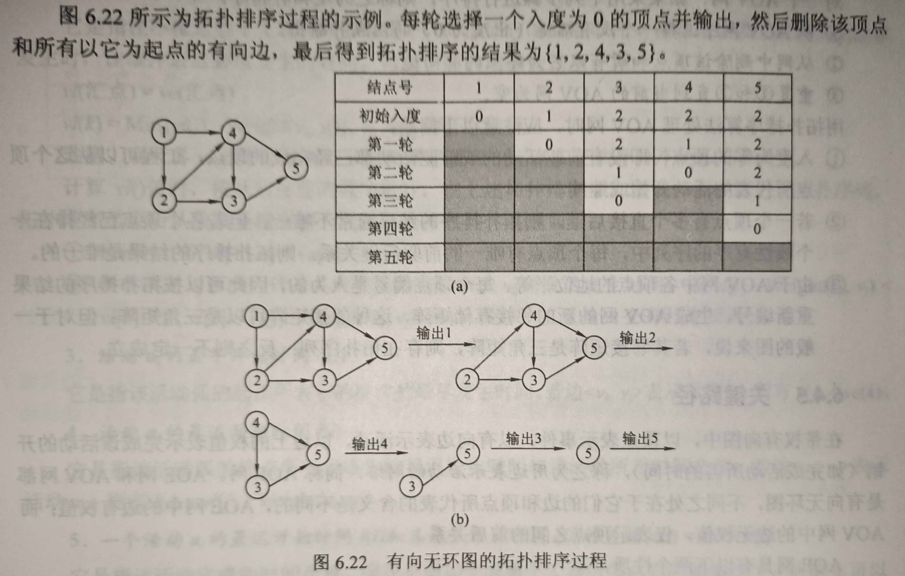 - 重复1. 2. 直到AOV网为空,或当前网中不存在无前驱的顶点为止(说明有向图中存在环)。