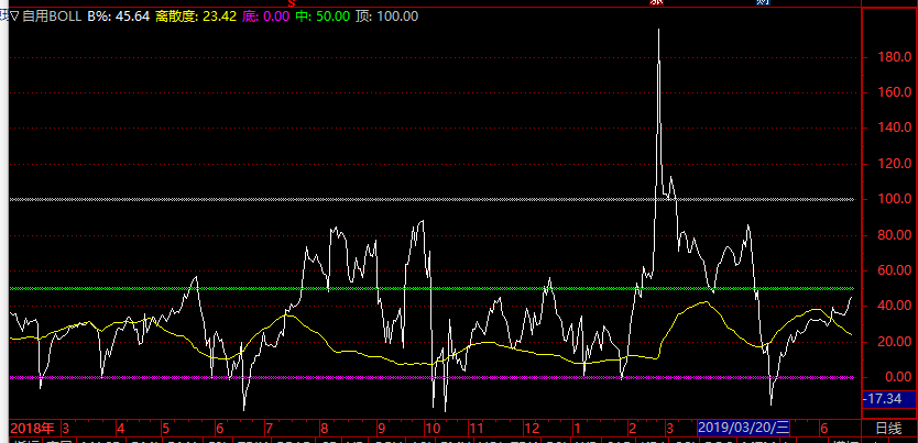 B%低于0,属于超跌区,可以抄底买入;当B%大于100,股价突破BOLL上轨,属于超买区,可减仓。