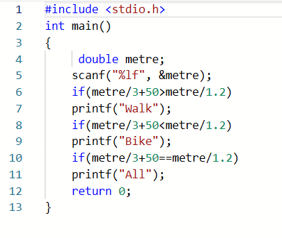 输出一行,如果骑车快,输出一行"Bike";如果走路快,输出一行"Walk";如果一样快,输出一行"All"。