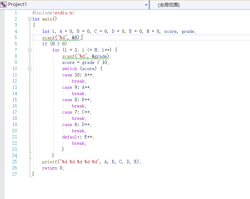 在一行中输出A、B、C、D、E对应的五分制成绩的人数分布,数字间以空格分隔,行末不得有多余空格。