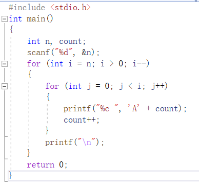 输出n行由大写字母A开始构成的三角形字符阵列。格式见输出样例,其中每个字母后面都有一个空格。