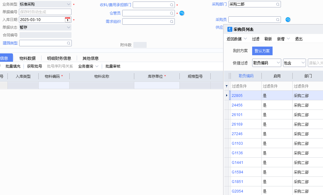 例:采购入库单中采购员所在的部门必须等于选中的采购部门,如下图所示: