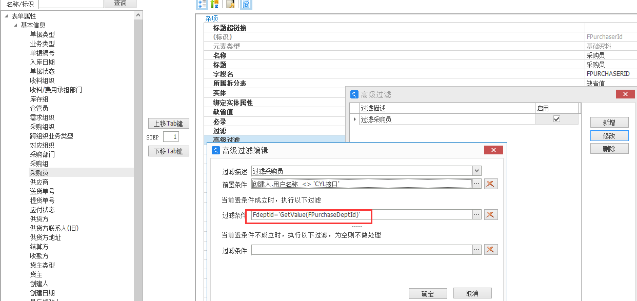采购员对应的高级过滤条件为:,Fdeptid='GetValue(FPurchaseDeptId)',FPurchaseDeptId为采购部门对应的标识,如下图所示: