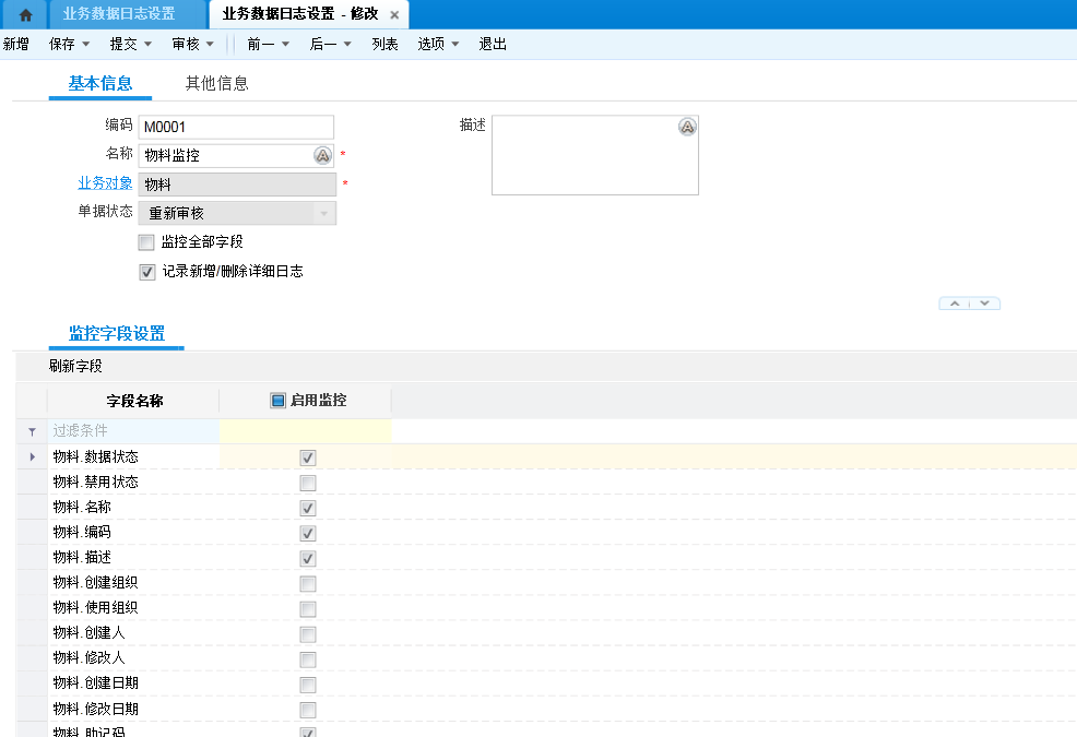 2、打开“业务数据日志设置”,自建需要监控的单据及字段,并提交、审核。