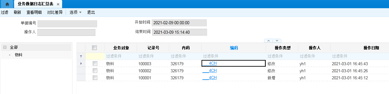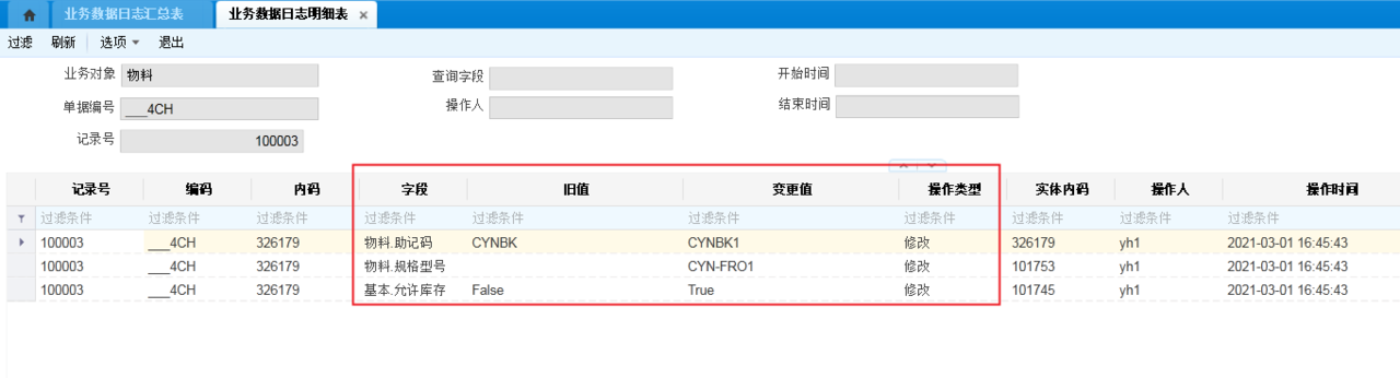 4、通过查看明细、对比差异、直接打开“业务数据日志明细表”等方式,都会打开数据日志的明细界面,按照不同方式传入的条件,展示对应的修改记录。