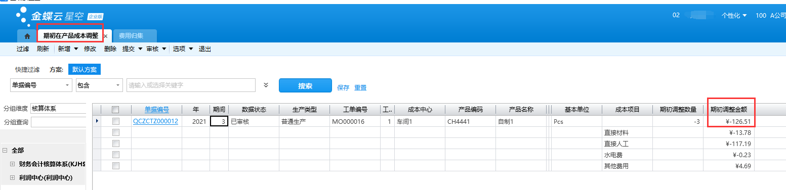 注意:当费用归集引入期初在产品成本调整单时,期初在产品成本调整单不需要再去生成凭证。并且费用归集引入的来源于期初在产品调整单的金额,与期初在产品调整单本身的金额互为相反数。原因是需要保证本期的总发生额为0,即引入金额+调整金额=0,这样综合来看才不会对成本本期投入有影响。