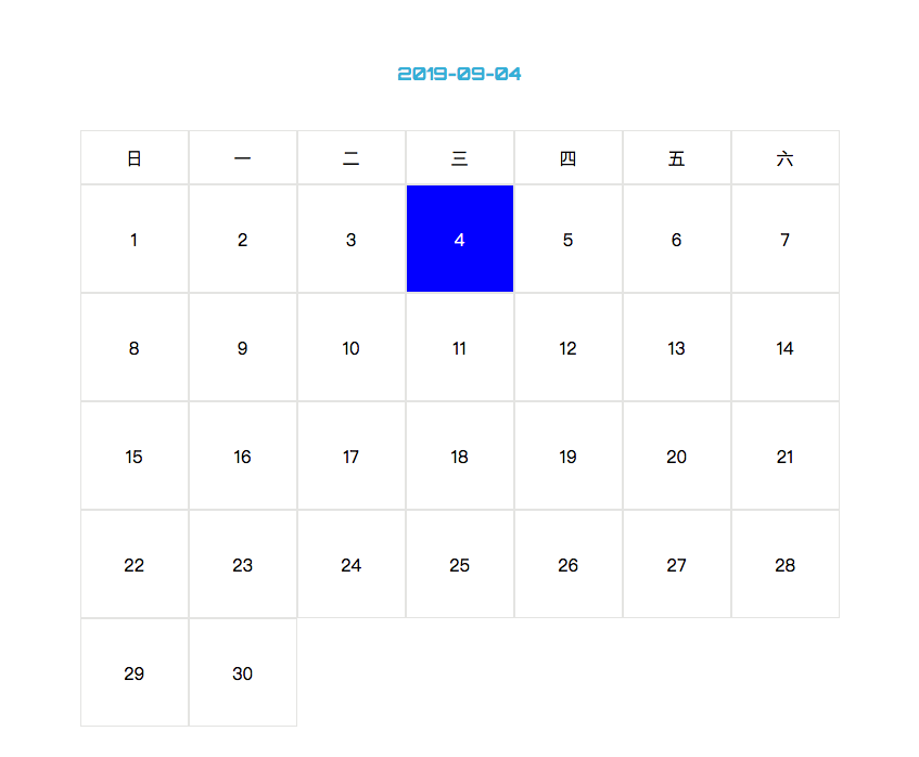 (function(){ const year = document.querySelector('.calendar_year'); const calendarList = document.querySelector('.calendar_list'); const weekList = ['日','一','二','三','四','五','六']; // 工作日标题 // 获取当前日期,格式为yyyy-MM-dd function getNowFormatDate(){ const date = new Date(); //日期分隔符 let seperator1 = '-'; let year = date.getFullYear(); // 年 let month = date.getMonth() + 1; // 月 let day = date.getDay() + 1; // 日 let currentDate = ''; if (month >= 1 && month <= 9) {// 月份不够两位补"0" month = '0' + month; } if (day >= 1 && day <= 9) {// 天数不够两位补"0" day = '0' + day; } // 拼接日期字符串 currentDate = year + seperator1 + month + seperator1 + day; const body = { currentDate:currentDate, year:year, month:parseInt(month), day:parseInt(day) } // 返回对象 return body; } // 生成星期与日期 function wrapWithLi(){ let weekStr = ''; // 存放星期字符串 let dayStr = ''; // 存放具体日期字符串 // 获取当前年份与月份 const currentYear = getNowFormatDate().year; const currentMonth = getNowFormatDate().month; // 计算当前月份对应天数 // 当前日期 const currenMonthDay = new Date(currentYear,currentMonth,0).getDate(); const currentDay = getNowFormatDate().day; // 生成星期 for(let week of weekList){ weekStr += `<li class="calendar_week">${week}</li>`; } // 生成日期 for(let i = 1;i <= currenMonthDay;i++){ if(i === currentDay){ dayStr += `<li class="current_day">${i}</li>`; }else{ dayStr += `<li class="calendar_item">${i}</li>`; } } return weekStr + dayStr; } // 鼠标选择高亮 function currHightlight(){ const lis = document.querySelectorAll('.calendar_item'); for(let li of lis){ li.addEventListener('mouseover',function(){ li.style.backgroundColor = '#dcdcdc'; }); li.addEventListener('mouseout',function(){ li.style.backgroundColor = ''; }); } } calendarList.innerHTML = wrapWithLi(); year.innerHTML = getNowFormatDate().currentDate; currHightlight(); })();