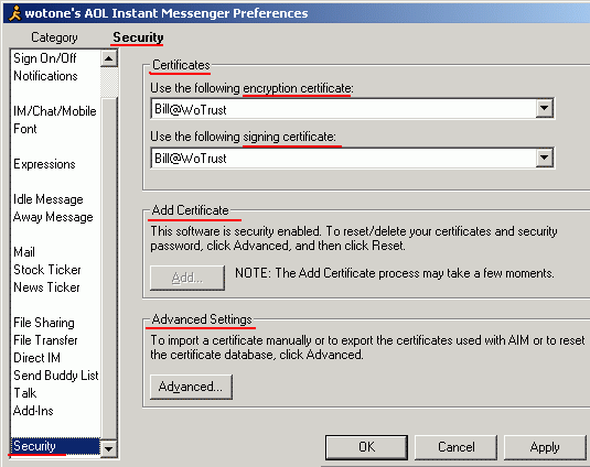 值得注意的是: AIM Messenger 还有一个非常好的安全特性就是支持使用个人证书来证明即时通信用户的真实身份以及使用此个人证书来实现即时消息的加密传输,从而确保即时通信的机密信息不会被非法窃取。如下图 5 所示,用户有两种选择,一是直接从 AIM 申请一个个人证书 (Add Certificate) ,二是导入现有的全球通用的支持浏览器的个人证书 (Advanced Settings - Import) 。