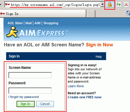 如下图 4 所示,我们再看看 AOL Messenger(美国在线)也一样部署了 SSL 证书来确保用户的即时通信帐号的安全: