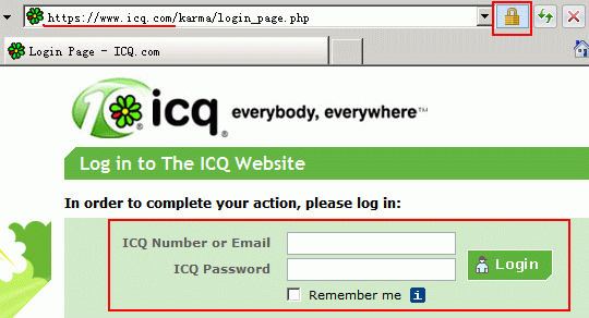 如下图 1 所示为即时通信鼻祖 ICQ 的登录页面,这里的 https 就是表明部署了 SSL 证书,从而保证了用户输入的密码不会在传输过程中被非法窃取: