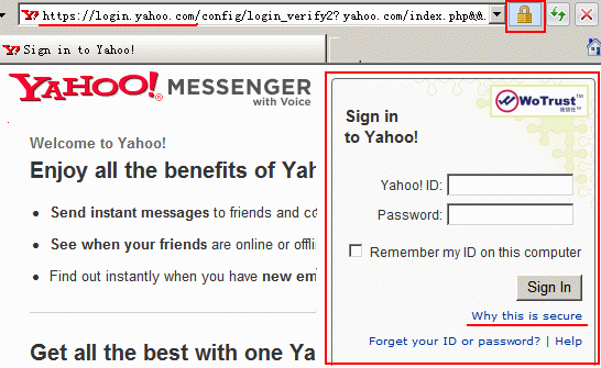 如下图 2 所示为 Yahoo Messenger 的登录页面,请注意在“ Sign In ”下面有“ Why this is secure (为何是安全的) ”的链接,点击此链接后可以看到 Yahoo 是如何解释为何是安全的:“ Yahoo 现在通过 SSL 加密使得您可以安全地提交您的 ID 和口令,这意味着您的个人帐户信息在每次登录时是安全的。过去, Yahoo 使用 MD5 来加密口令,但保护您的隐私和在线信息安全对 Yahoo 来讲是特别重要的事,所以,我们在不断地评估各种安全技术来保护您的个人信息,现在, Yahoo 部署了 SSL 证书来保护您的 ID 和口令的安全, Yahoo 非常重视您的个人信息安全!”这段话值得所有即时通信服务提供商和所有电子商务服务提供商学习!同时,值得一提的是: Yahoo 为了防止网络钓鱼者使用假冒 Yahoo 网站来获得用户的登录密码而允许用户自己定制一个登录标志来识别是否正在登录真正的 Yahoo 网站。
