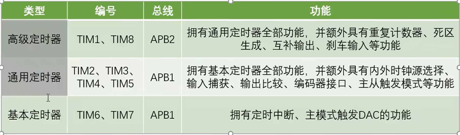 - 根据复杂度和应用场景分为高级定时器,通用定时器和基本定时器
