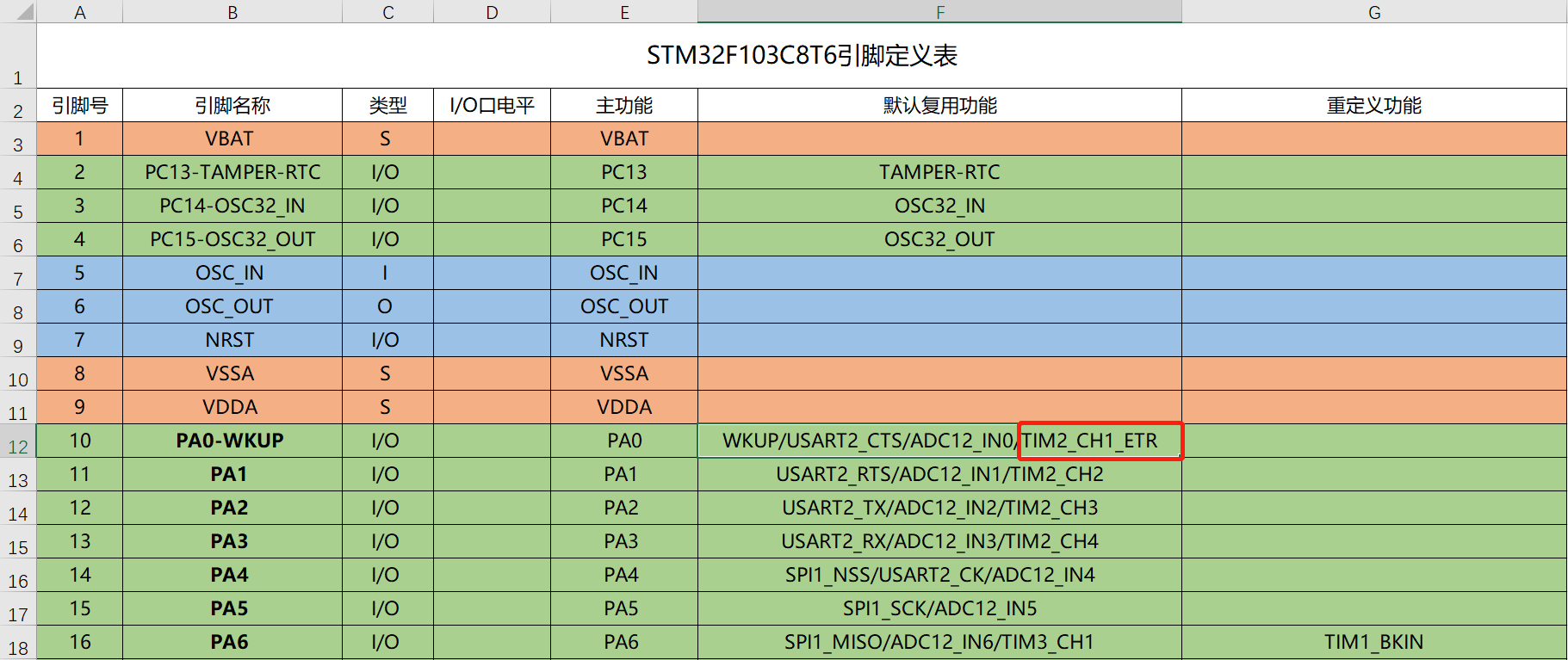 例如TIM2_CH1_ETR就是TIM2(定时器)的CH1(通道)和ETR(外设)都复用在了PA0这个引脚。CH是通道Channel的意思