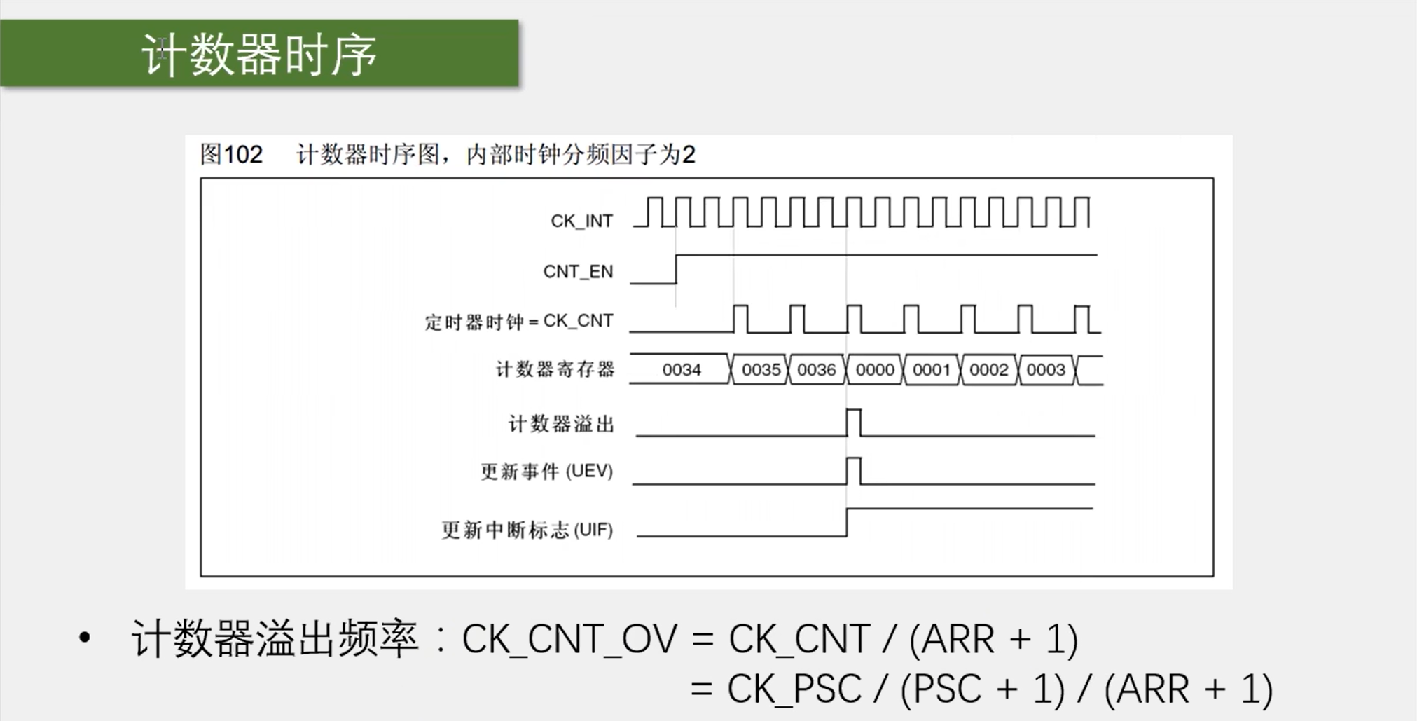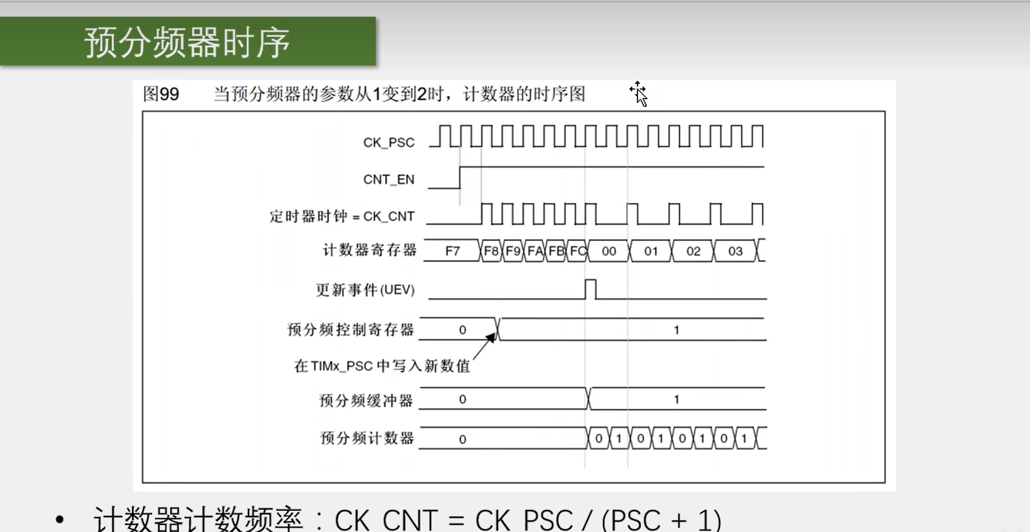 计数器时钟CK_CNT:既是预分频器的时钟输出也是计数器的时钟输入 - 计时器未使能时,计数器时钟不运行。使能后,前半段预分频器系数为1,计数器的时钟等于预分频前的时钟;后半段预分频器系数为2,计数器的时钟变为预分频器前时钟的一半