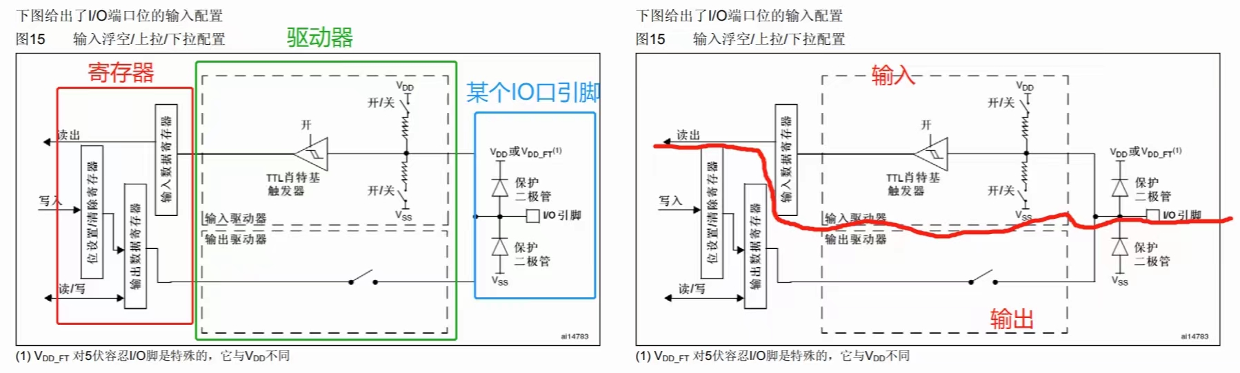 - 为了保护IO引脚,上下各接一个保护二极管,用于限幅输入电压。
