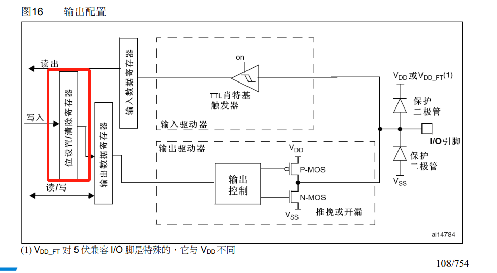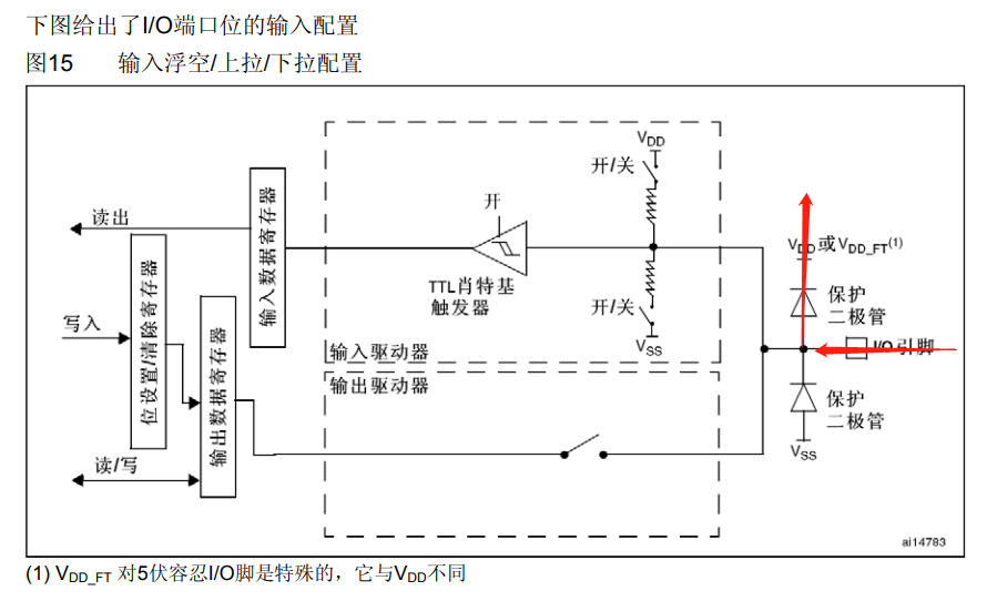 - 如果输入电压比3.3V还要高,上面二极管导通,输入电压产生的电流会直接流入VDD而不是内部电流。