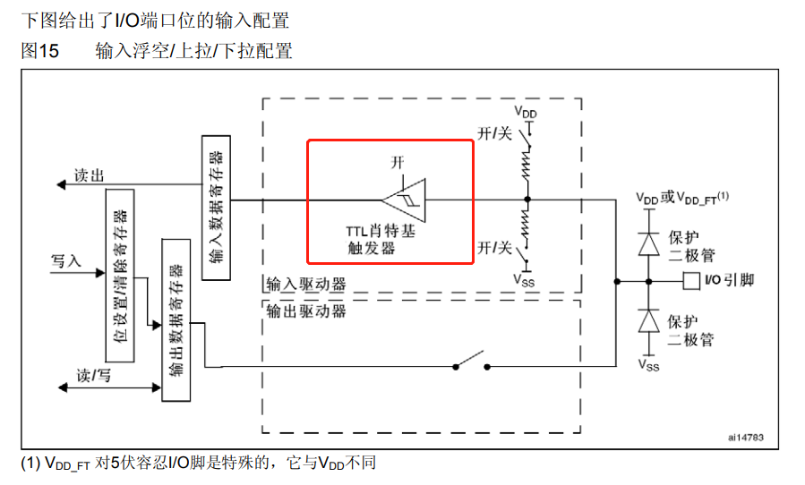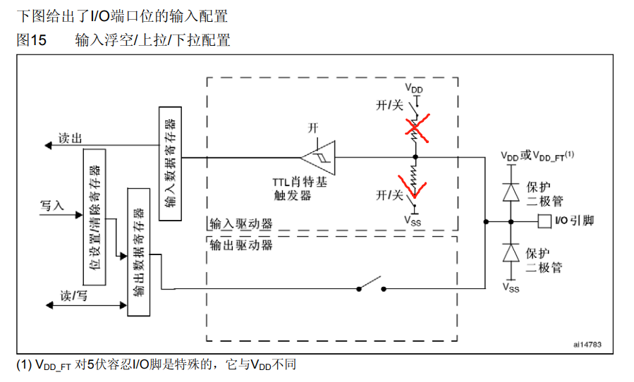 - 上面二极管接VDD(3.3V),下面的二极管接VSS(0V)。