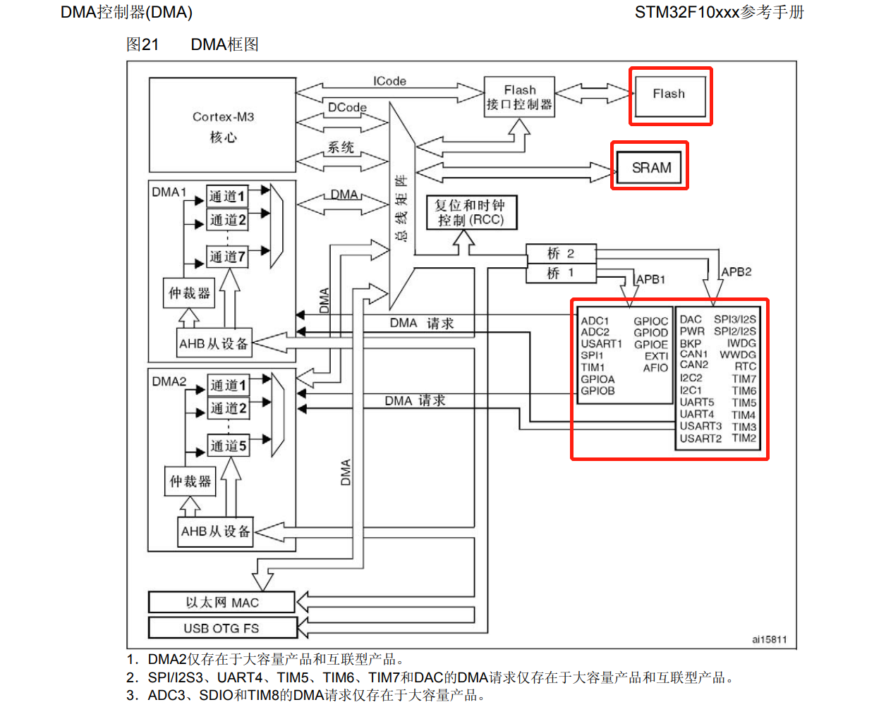 - 总线矩阵以左为主动单元(内核DMA和DMA主线),拥有存储器的访问权。其中DcODE总线是专门访问Flash的,系统总线是访问其他东西的。