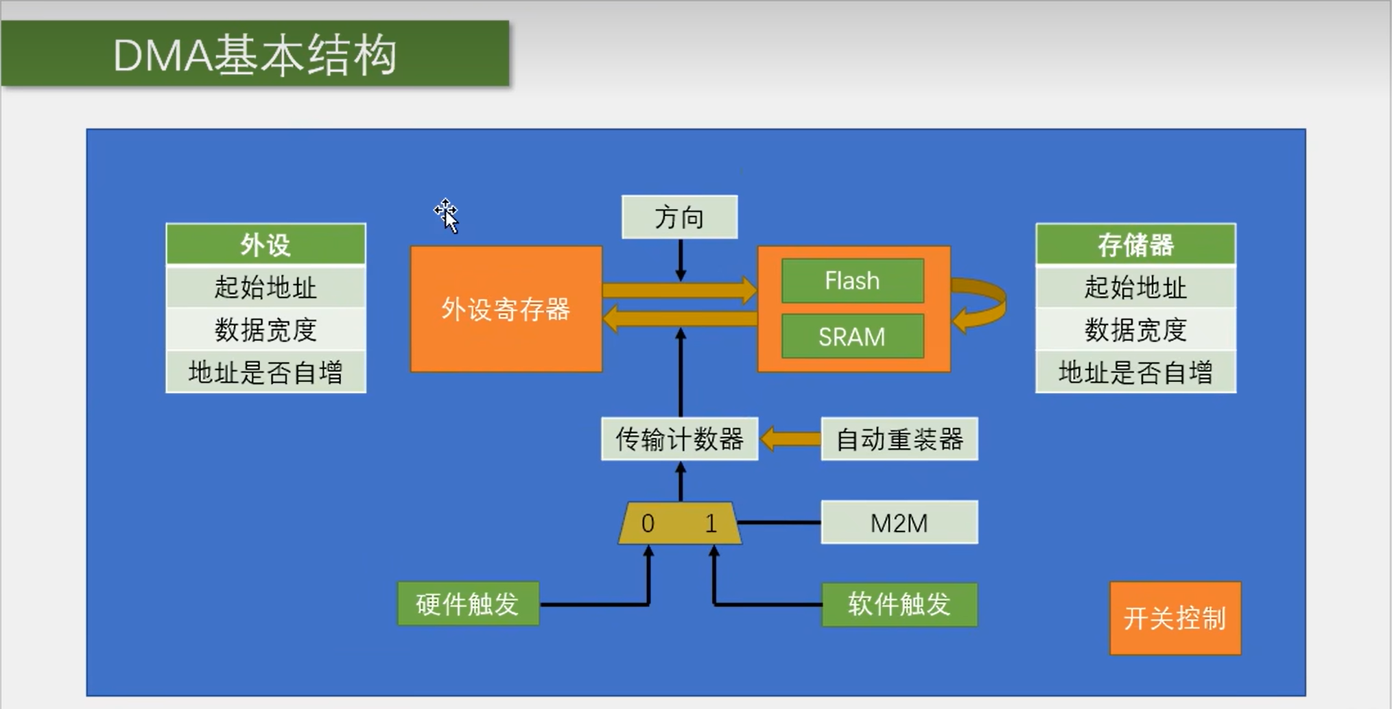 - AHB从设备是DMA自身的寄存器,连接在总线右边的AHB总线上,故DMA既是总线矩阵的主动单元,也是AHB总线上的被动单元。