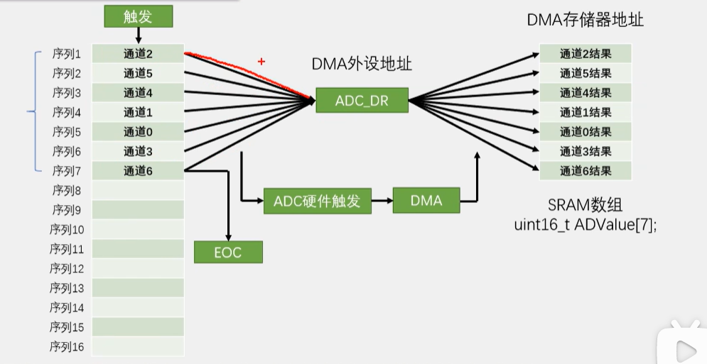 - 每个单独通道转换完成后,进行一次DMA数据转运,并且目的地址进行自增