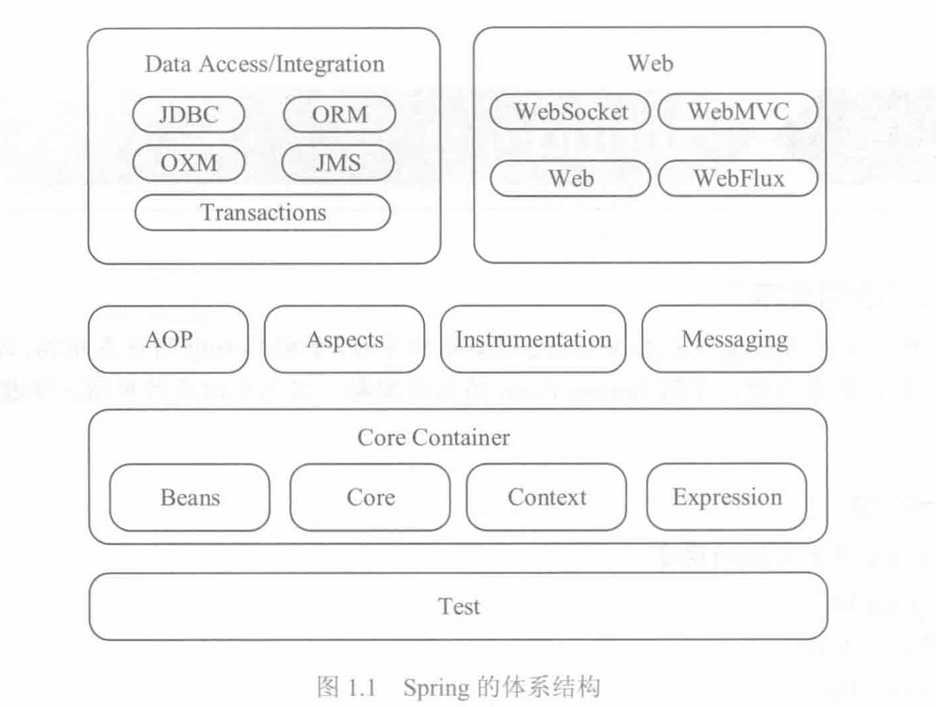 Spring的功能模块被有组织地分散到约20个模块中,这些模块分布在核心容器(CoreContainer)层、数据访问/集成(DataAccess/Integration)层、Web层、面向切面的编程(AspectOriented Programming,AOP)模块、植入(Instrumentation)模块、消息传输(Messaging)和测试(Test)模块中,如图1.1所示。